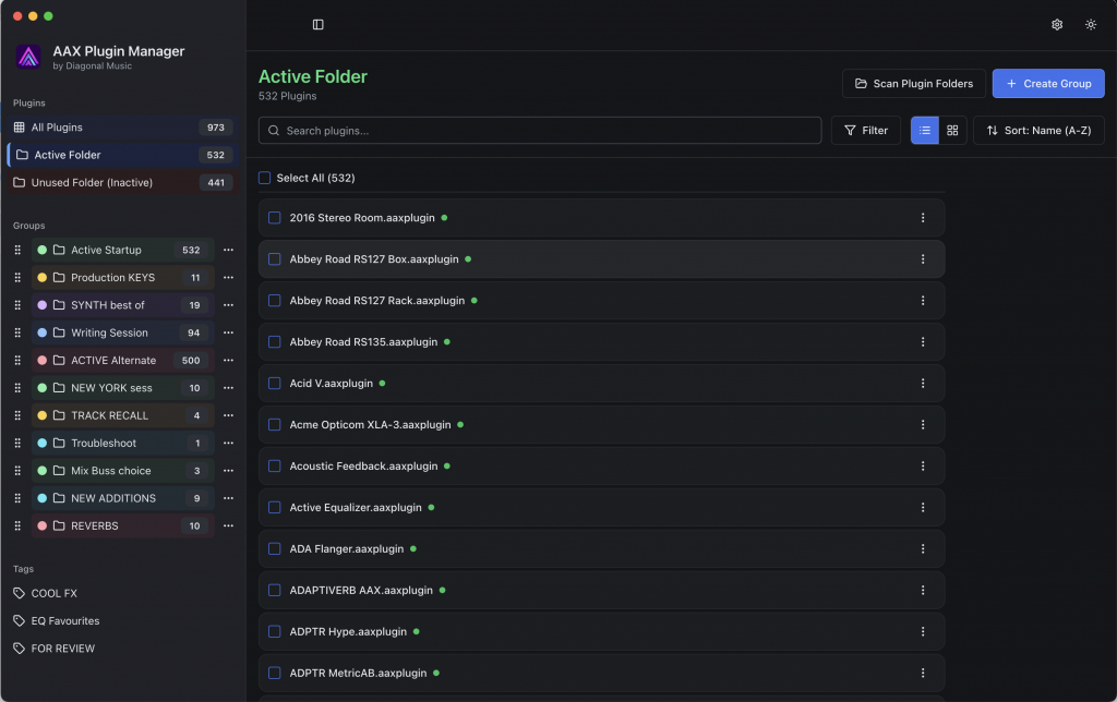 Scan your Folders – then add your plugins to Groups – easily move them to your Active Folder for session specific plugin setups. User Tags let you go even deeper into sorting your plugin collection.
