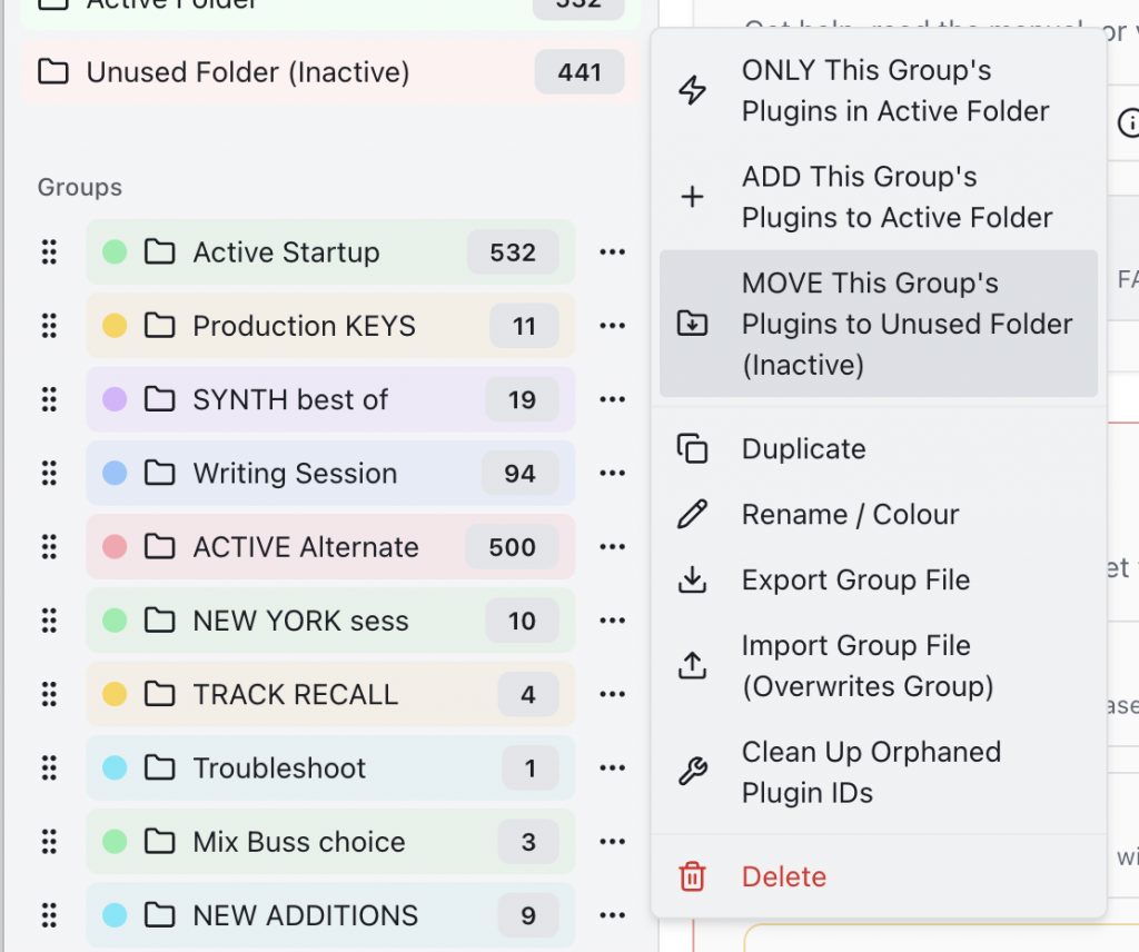 Groups – Create multiple lists of plugins – with one click move to your Active Folder. Import and Export for backup and second computers.